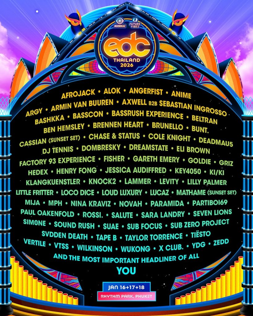 EDC Thailand está preparando una edición que promete ser inolvidable. Del 16 al 18 de enero de 2026, este festival regresará a Rhythm Park, Phuket, con un cartel lleno de leyendas de la música electrónica y headliners que harán vibrar todos los escenarios.