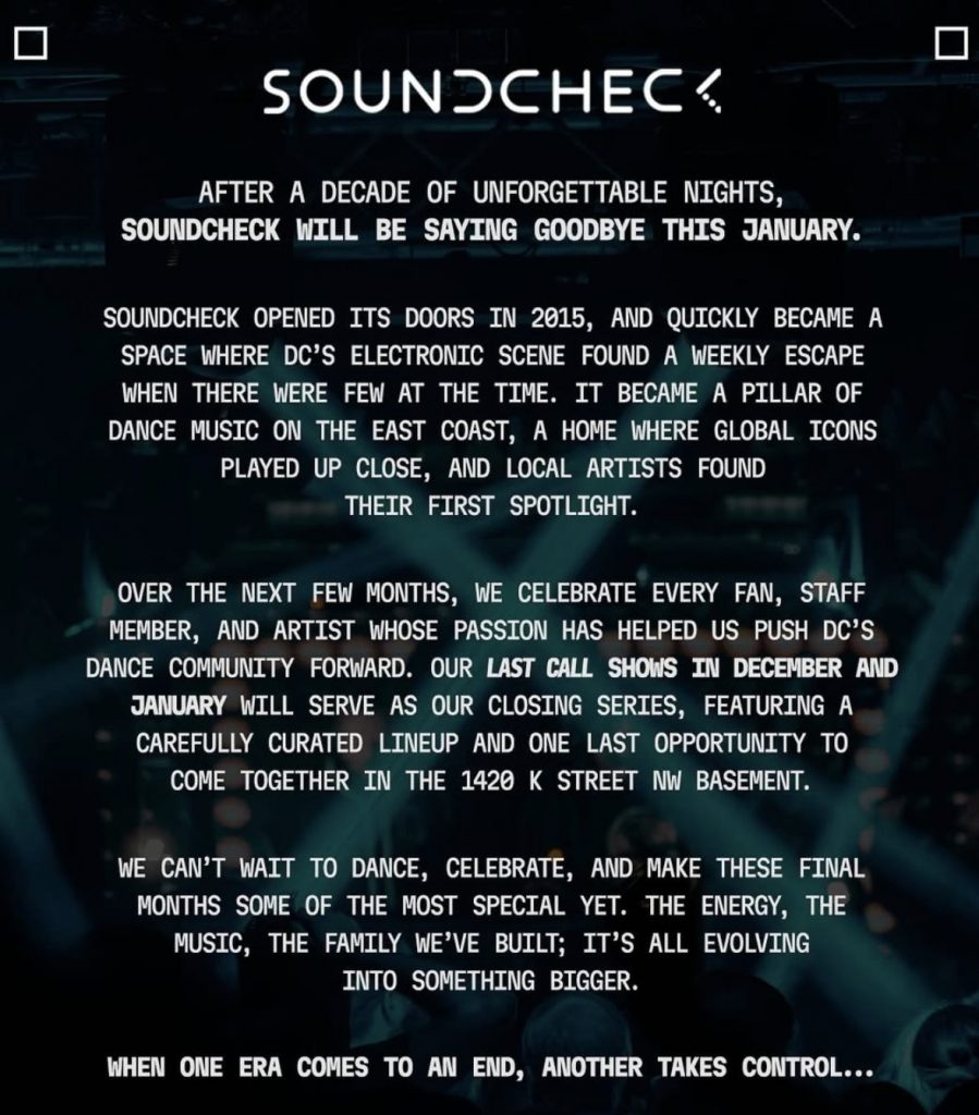 El equipo del club compartió un mensaje en Instagram: “Después de una década de noches inolvidables, Soundcheck se despedirá este enero. Abrió sus puertas en 2015 y rápidamente se convirtió en un lugar donde la comunidad electrónica de DC encontraba un escape semanal”.